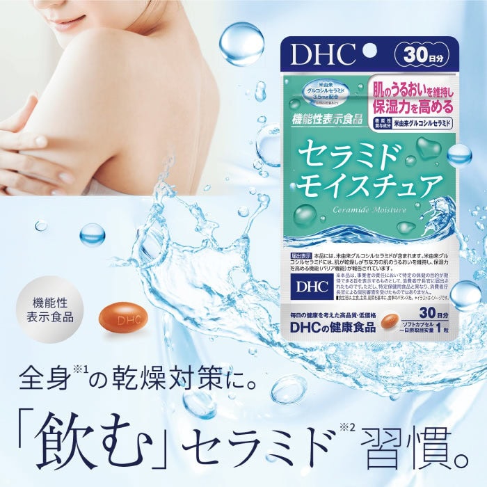 DHC神經酰胺補水保濕丸是可全身保濕的「口服」神經醯胺產品,持續使用能維持肌膚水嫩。特別添加了每日3.5毫克來自米的糖基化神經醯胺,已報告有助於維持全身肌膚的保濕。