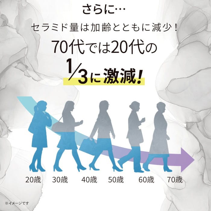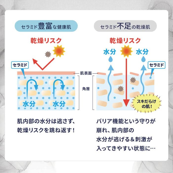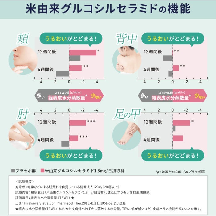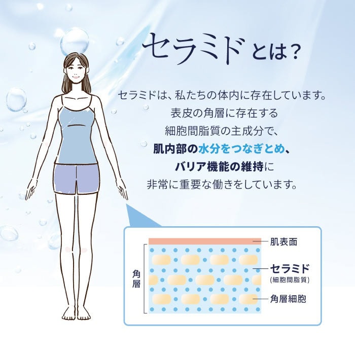 隨著年齡增長,神經醯胺可能減少,導致乾燥肌膚。神經醯胺是一種存在於全身表皮的保濕成分,有助於維持皮膚的屏障功能和水分。本產品中的來自米的糖基化神經醯胺能從內部維持肌膚水分,並減少水分蒸發。