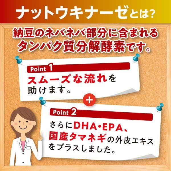 - 納豆激酶:納豆中含有的特有成分納豆激酶,具有幫助血液流動順暢的功效。本產品每劑量含有3,100 FU的納豆激酶,有效促進血液循環。