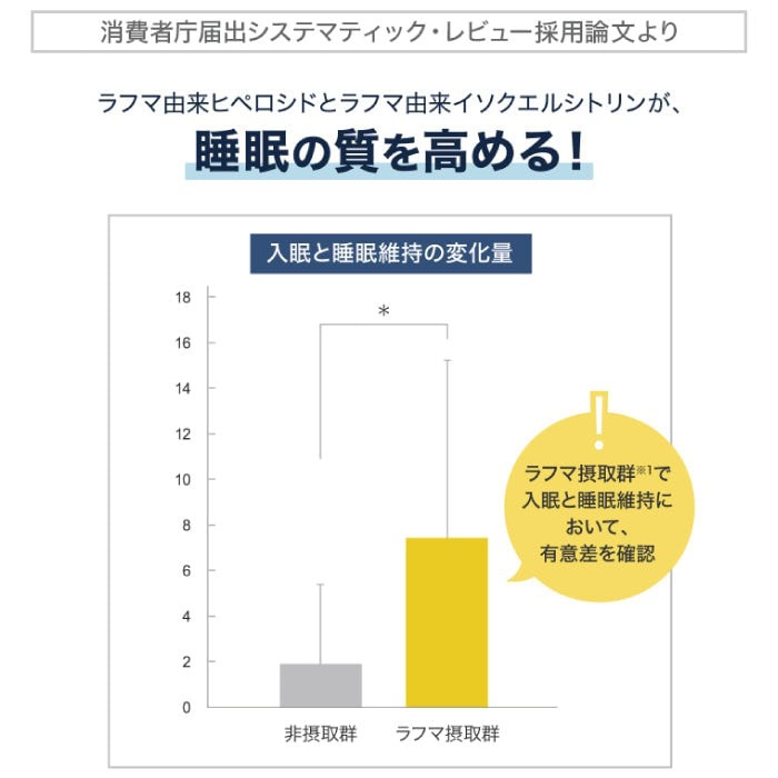 睡眠質量提升,支持深層睡眠和良好醒來! 根據厚生勞動省的調查,30~40歲的三分之一人群感到「睡眠未能充分休息」。 為了每天健康生活,提高睡眠質量是非常重要的。「Nemurilac」是一款支持深層睡眠和良好醒來的功能性表示食品。 配方中包含了三種功能性成分:來自羅布麻的洋常春藤苷、來自羅布麻的異槲皮苷、以及來自長胡椒的胡椒碱類。